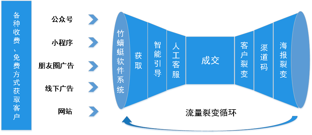 智能引導、模板喚醒、渠道碼溯源、粉絲裂變、粉絲畫像、智能客服、轉接、插話,實時監控