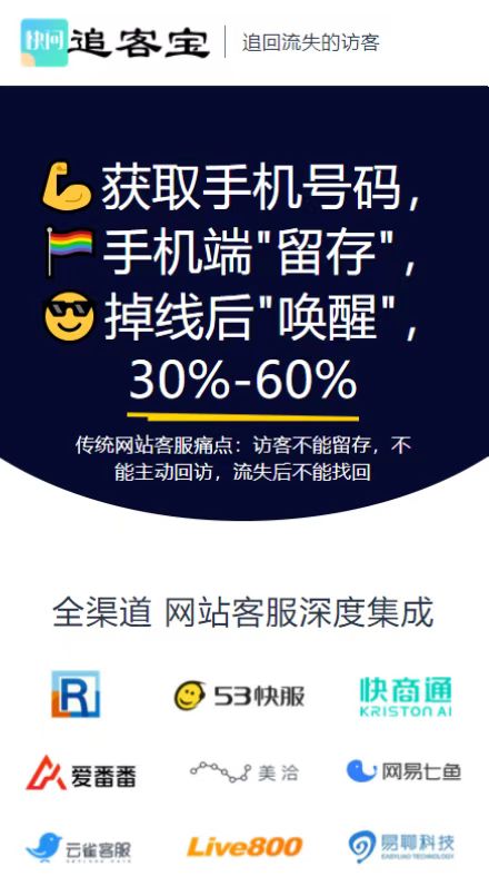 快應(yīng)用技術(shù),由小米,OPPO,vivo,華為等 10 家國內(nèi)主流廠商成立了快應(yīng)用聯(lián),聯(lián)合推同快應(yīng)用技術(shù)。訪客掉線離線后,能在手機(jī)端留存入口,秒裝到用戶手機(jī)上,可快速喚醒找回掉線離線訪客,喚醒率30%~60%。 全渠道網(wǎng)站客服深度集成:商務(wù)通、快商通、53快服、易聊等。